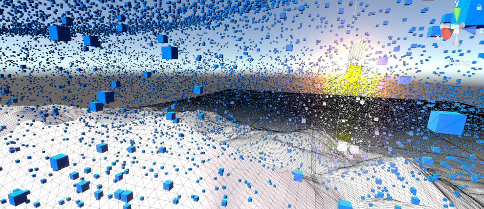 Now the goal is to reintroduce mesh-based offsets into the shader system, so the swarm can form shapes again and follow a central game object. Eventually, we want users to be able to manipulate that object themselves — guiding a massive swarm across the landscape in VR.”